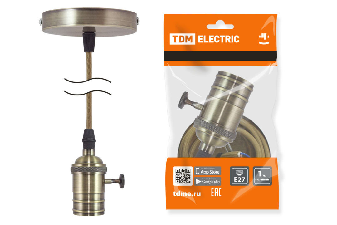 Патрон Е27 с выключателем с подвесом 1 м, металлический "Лофт", бронза TDM