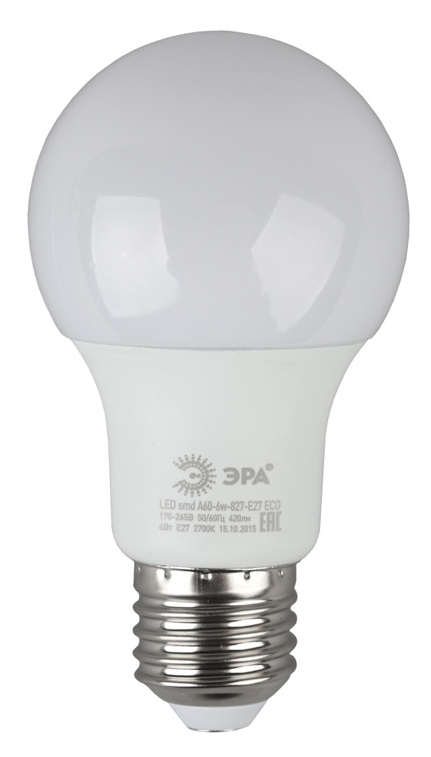 Лампы СВЕТОДИОДНЫЕ ЭКО ECO LED A60-6W-827-E27 ЭРА (диод, груша, 6Вт, тепл, E27)