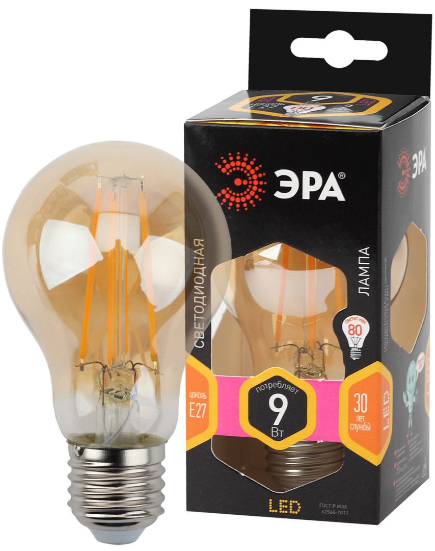 Лампы СВЕТОДИОДНЫЕ F-LED F-LED A60-9W-827-E27 gold ЭРА (филамент, груша золот., 9Вт, тепл, Е27)