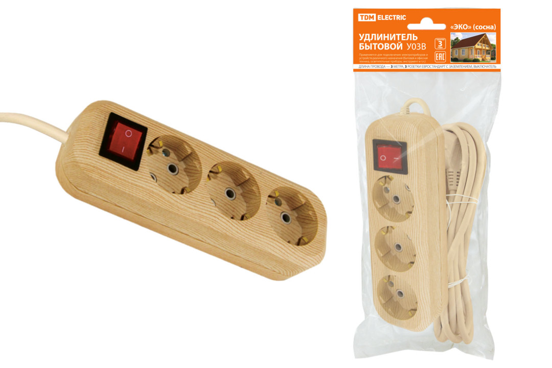 Удлинитель бытовой У03В выключатель, 3 гнезда, 3метра,2П+3, ПВС 3х1мм2 "Эко" (сосна) 16А/250В TDM