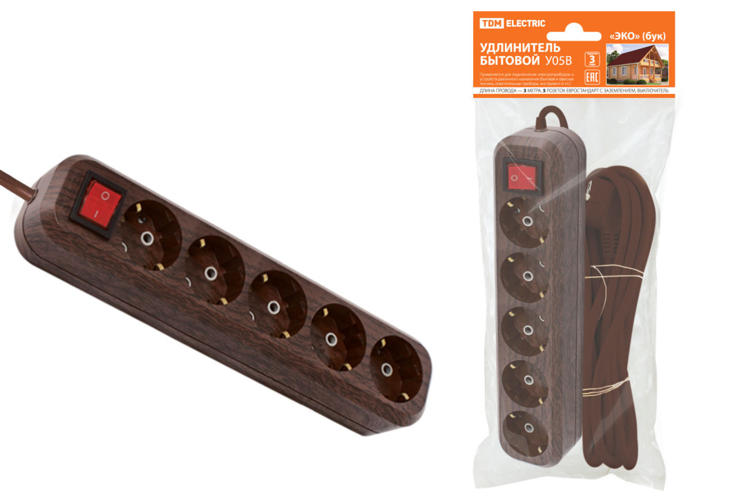 Удлинитель бытовой У05В выключатель, 5 гнезд, 3метра,2П+3, ПВС 3х1мм2 "Эко" (бук) 16А/250В TDM