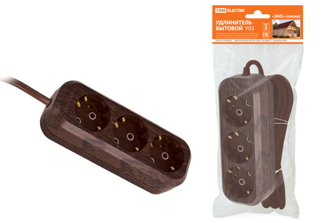 Удлинитель бытовой У03 3 гнезда, 5метров,2П+3, ПВС 3х1мм2 "Эко" (бук) 16А/250В TDM