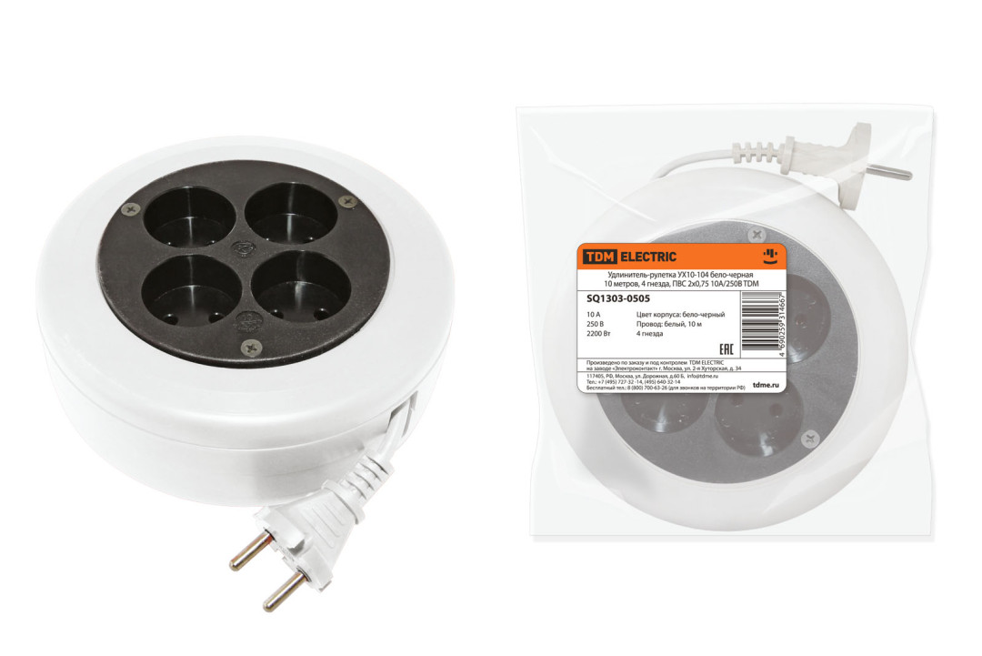 Удлинитель-рулетка УХ10-104 бело-черная 10 метров, 4 гнезда, ПВС 2х0,75 10А/250В TDM