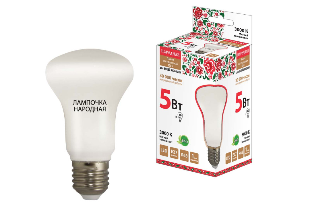 Лампа светодиодная R63 - 5 Вт-230 В -3000 К–E27 Народная