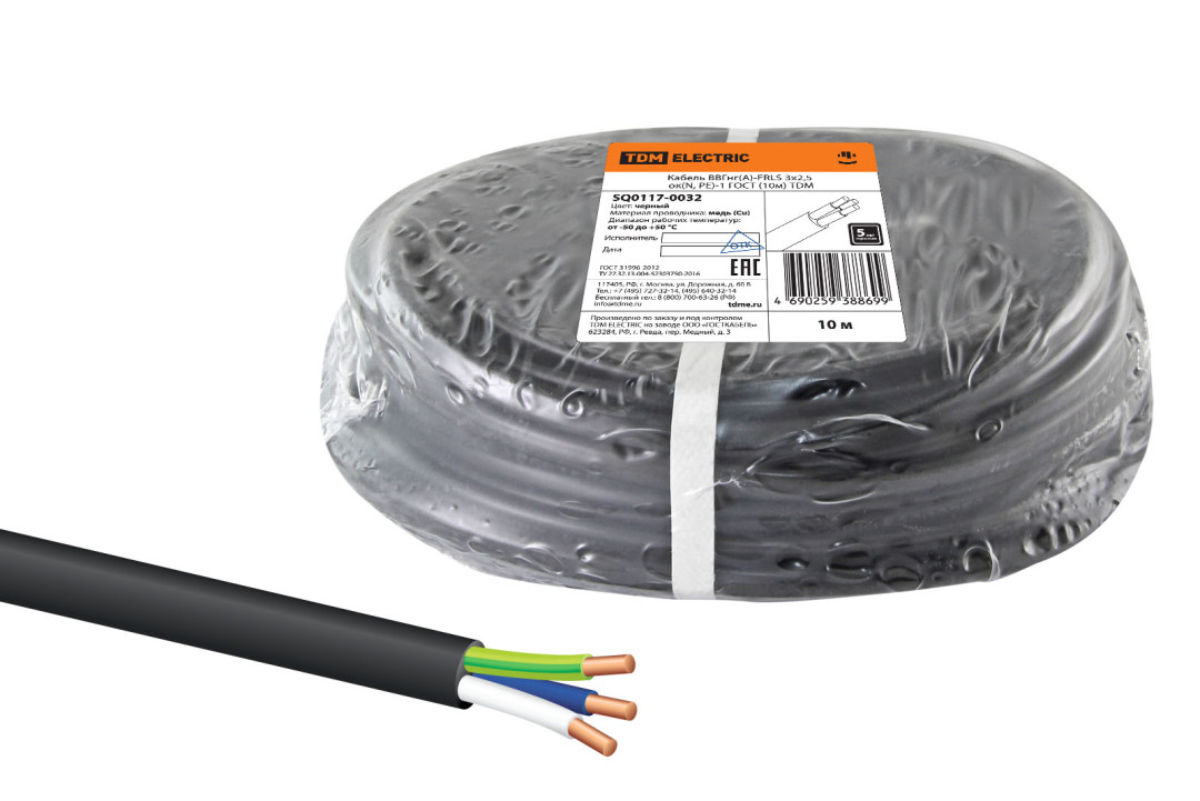 Кабель ВВГнг(А)-FRLS 3х2,5 ок(N, PE)-1 ГОСТ (10м) TDM