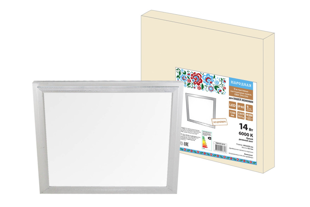 Ультратонкая светодиодная панель серии СВО 295х295, 14 Вт, 6000 К, хром, Народная