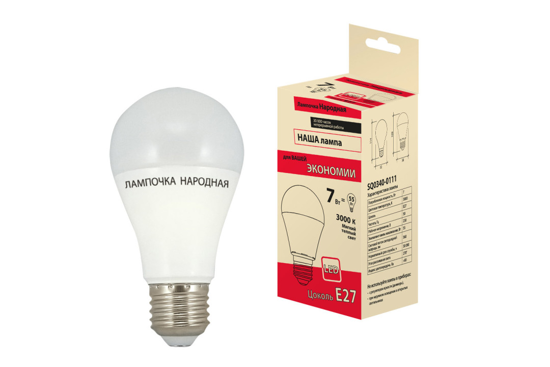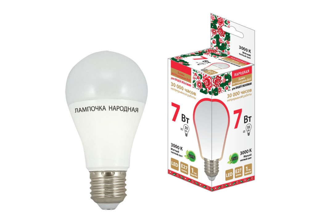 Лампа светодиодная НЛ-LED-A60-7 Вт-230 В-3000 К-Е27, (58х109 мм), Народная