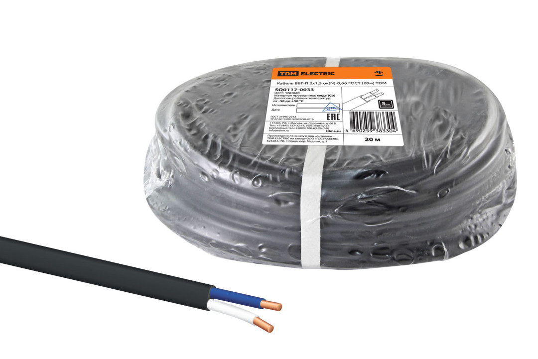 Кабель ВВГ-П 2х1,5 ок(N)-0,66 ГОСТ (20м) TDM