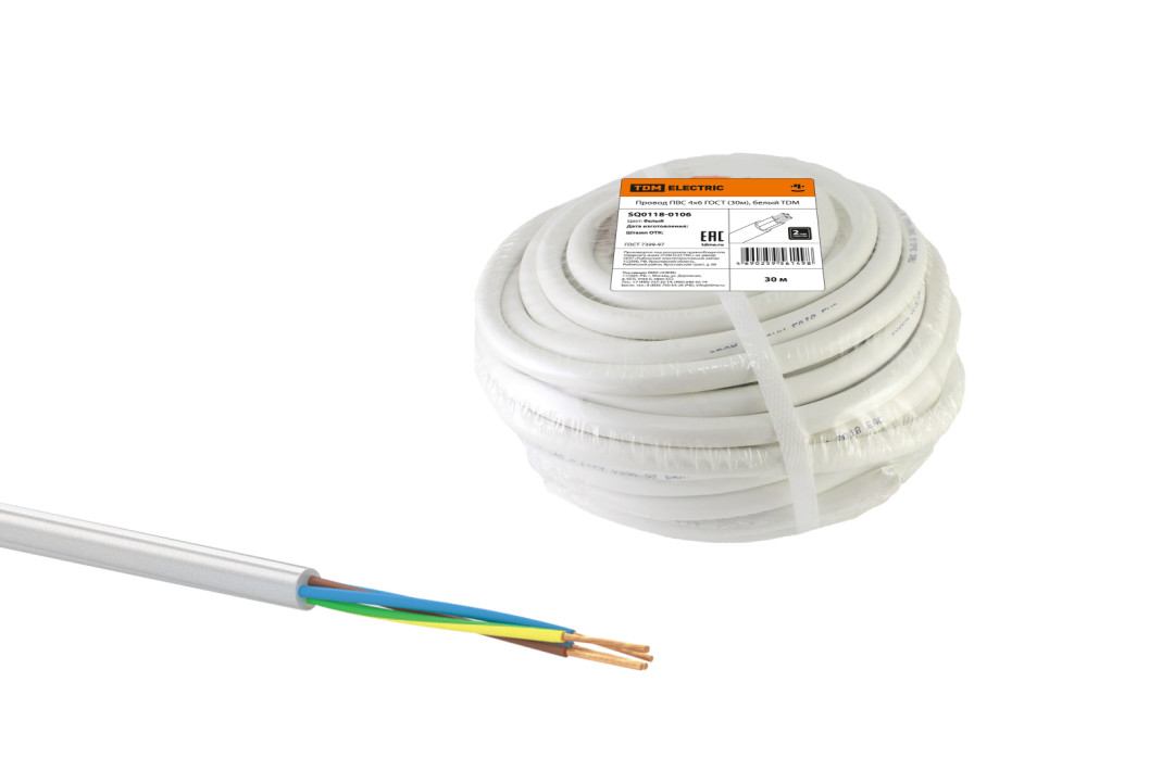 Провод ПВС 4х6 ГОСТ (30м), белый TDM