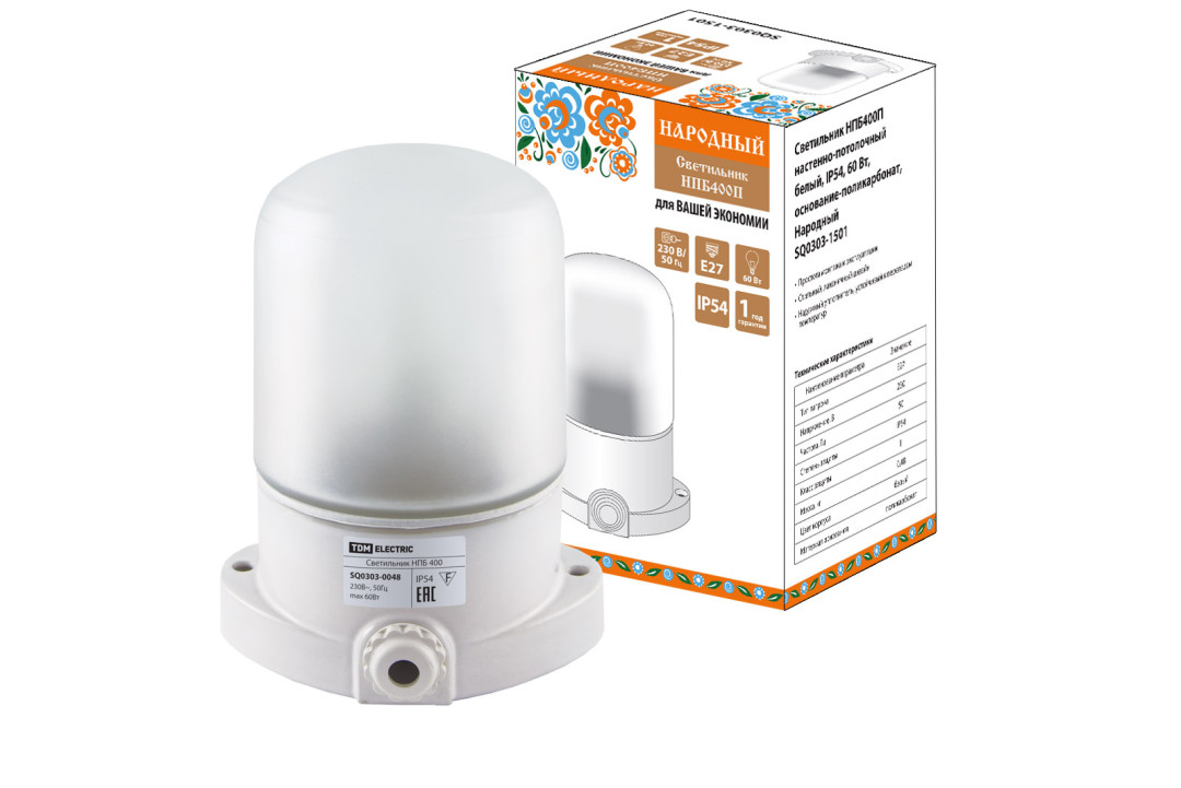 Светильник НПБ400П настенно-потолочный белый, IP54, 60 Вт, основание-поликарбонат, Народный