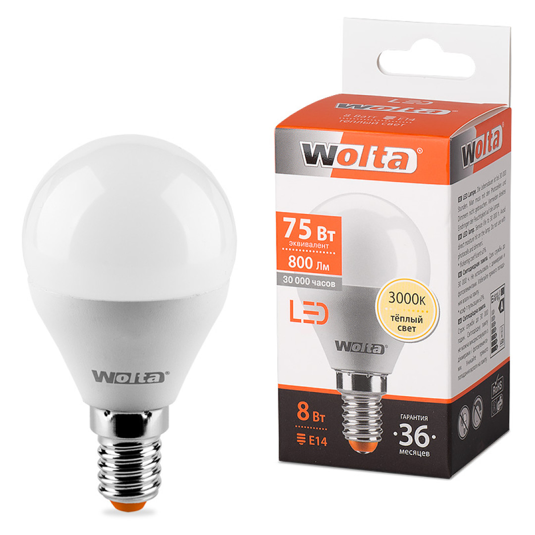 Лампа LED WOLTA G45 8Вт 800лм Е14 3000К 1/50
