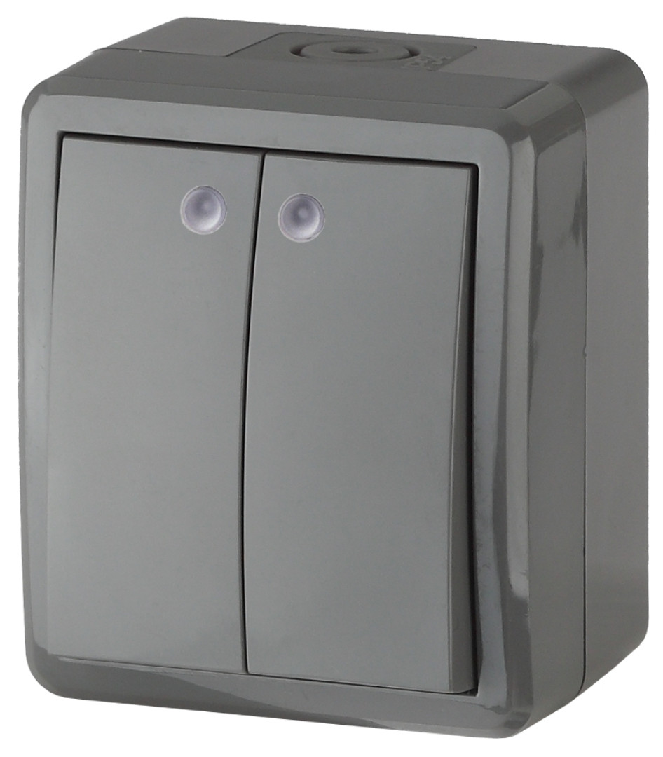 11-1405-03 ЭРА Выключатель двойной с подсветкой IP54, 10АХ-250В, ОУ, Эра Эксперт, серый