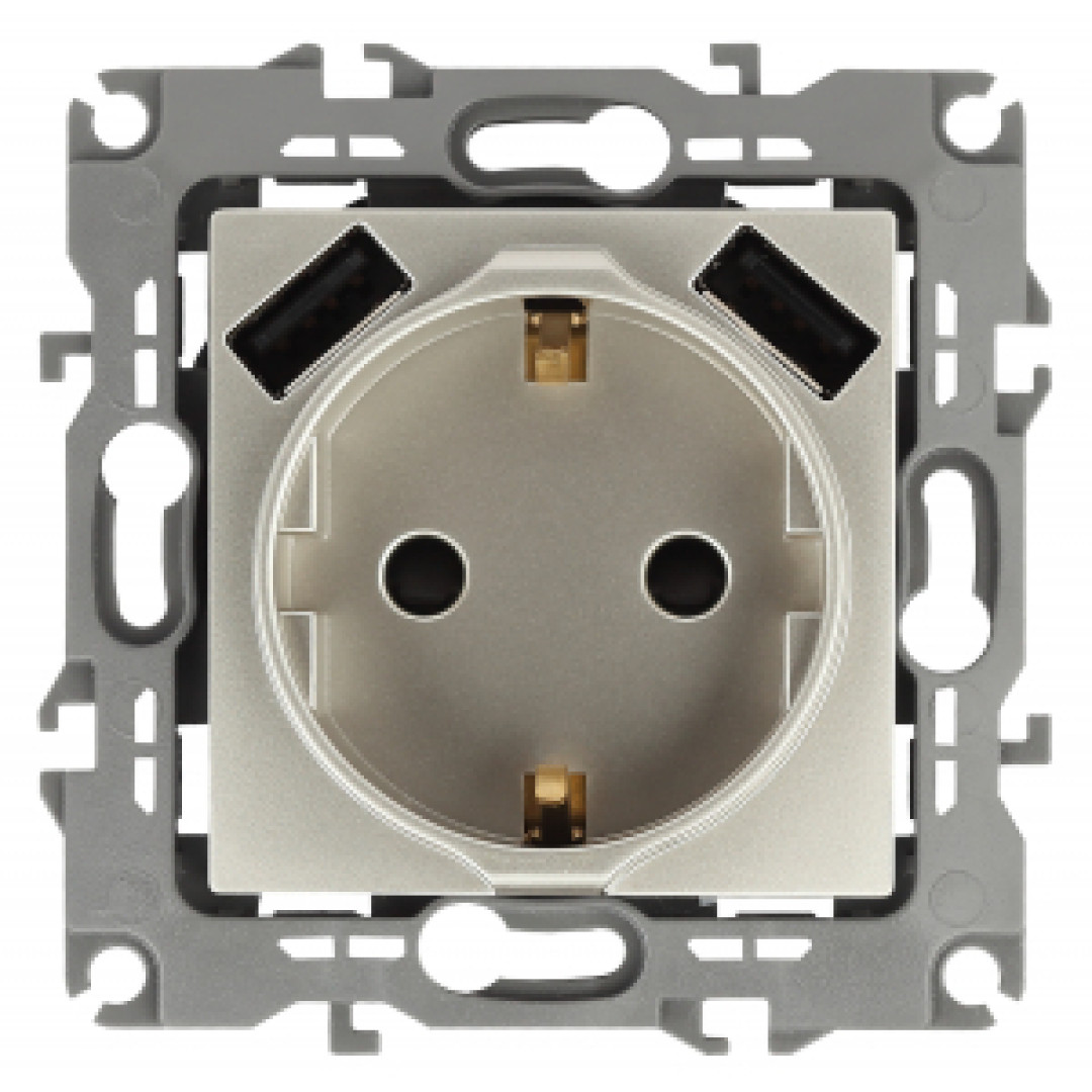 14-4109-04 ЭРА Розетка 2P+E 16A-250В, штор. с 2xUSB 5В-3А, Эра Elegance, шампань (10/100/2000)