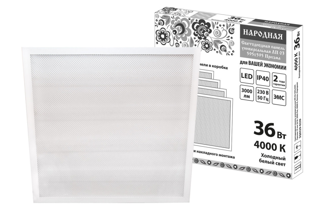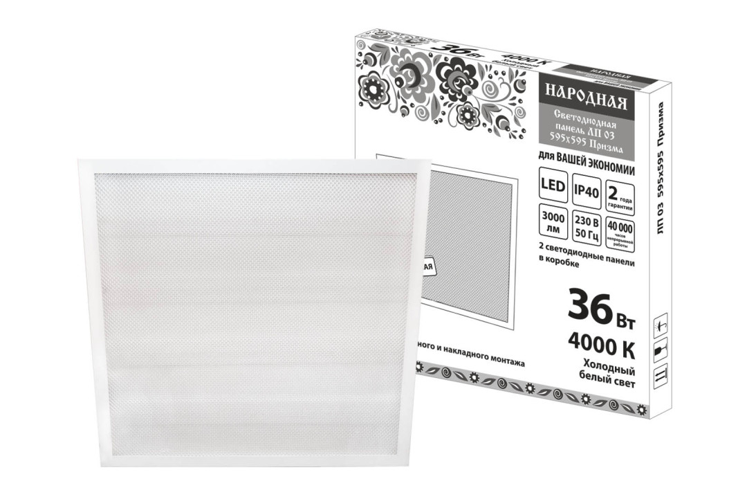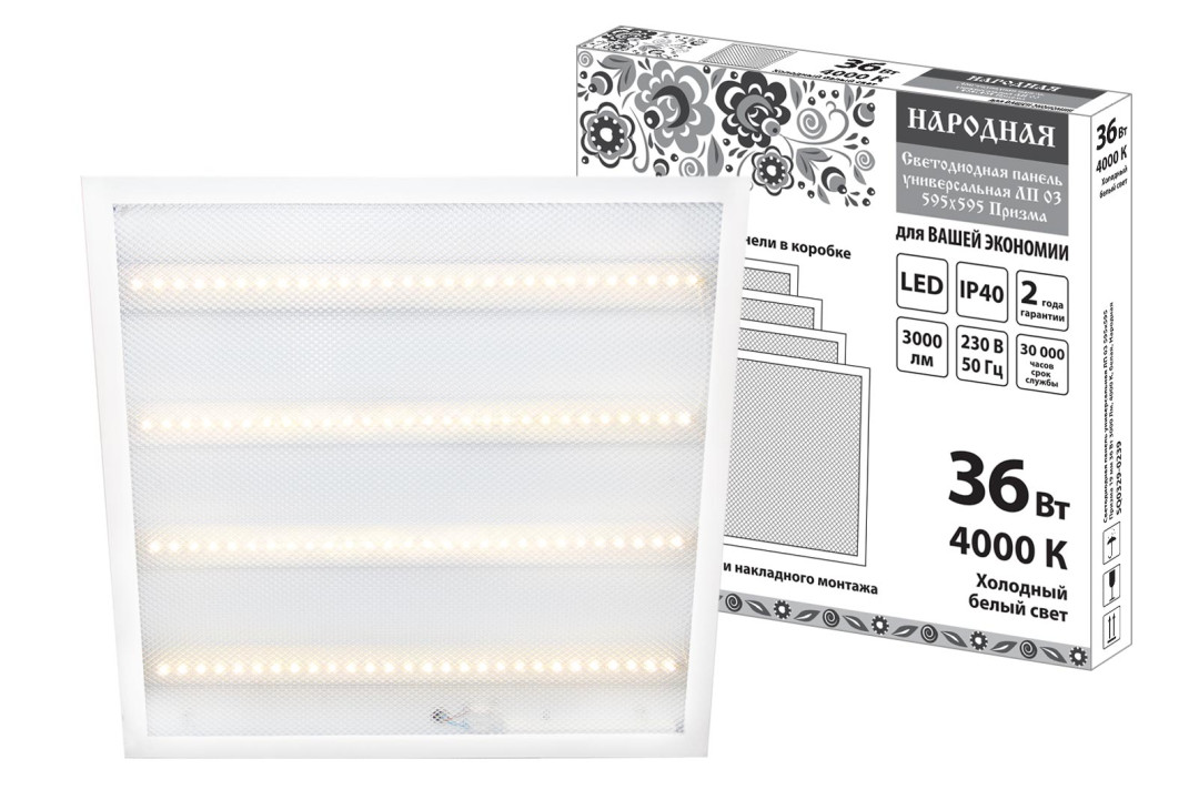 Светодиодная панель универсальная ЛП 03 595х595 Призма 19 мм 36 Вт 3000 Лм, 4000 К, белая, Народная