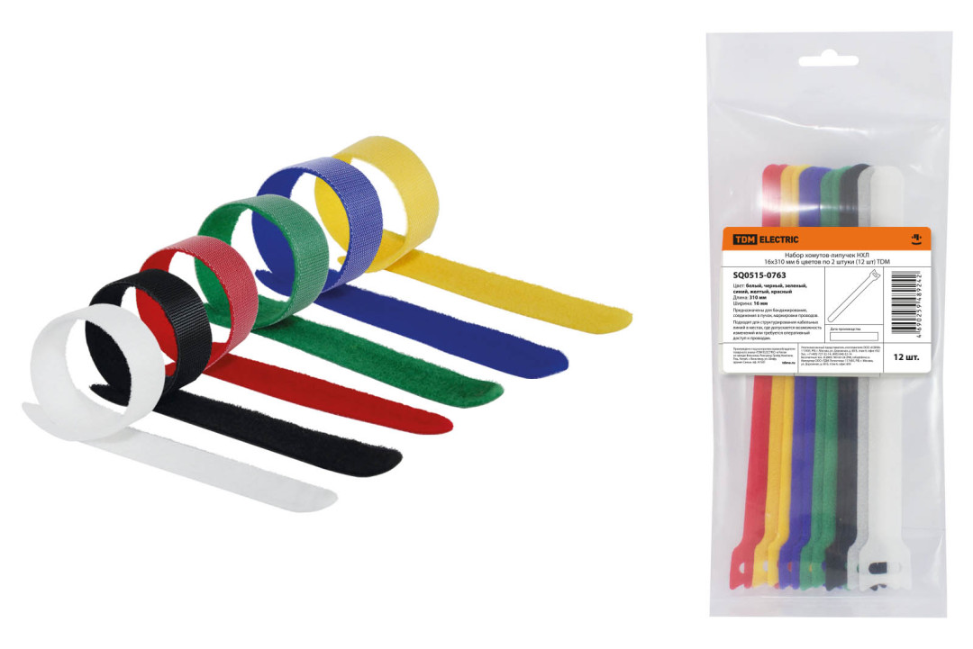 Набор хомутов-липучек НХЛ 16х310 мм 6 цветов по 2 штуки (12 шт) TDM