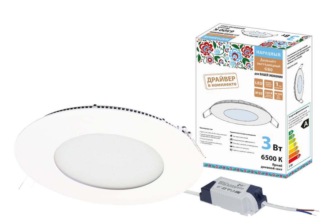 Светильник ультратонкий встраиваемый светодиодный "Даунлайт НАРОДНЫЙ" СВО (белый) 3 Вт 6500К
