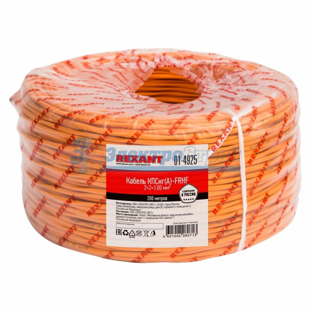 Кабель КПСЭнг(А)-FRHF 2x2x1,00 мм REXANT симметричный парной скрутки, огнестойкий, безгалогенный, не распространяющий горение при групповой прокладке и не выделяющий коррозионно-активных газообразных продуктов при горении и тлении. Кабель состоит из однопроволочного медного проводника, изоляции из огнестойкой керамизирующейся кремнийорганической резины, дренажного медного проводника, экрана из алюминиевой фольги и оболочки из ПВХ пластиката, не содержащей галогенов. Кабель сохраняет работоспособность в условиях пожара в течение 180 минут. Номинальное напряжение тока до 300 В, частотой 50 Гц. Использование кабеля КПСЭнг(А)-FRHF 2x2x1,00 мм REXANT регламентирует сертификат соответствия Таможенного Союза (EAC). Применяется для одиночной или групповой прокладки (с учетом объема горючей загрузки) цепей питания электроприемников систем противопожарной защиты, операционных и реанимационно-анестезионного оборудования больниц и стационаров, в местах большого количества скопления людей (больницы, школы, сады, торговые центры, аэропорты, вокзалы, метро), а также в других важных системах жизнеобеспечения, которые должны сохранять работоспособность в условиях пожара.