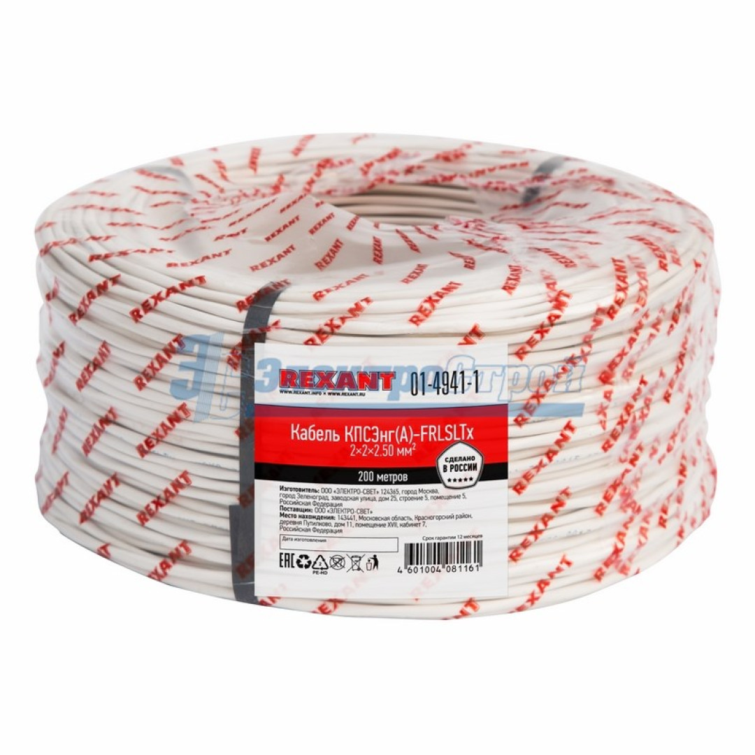 Кабель КПСЭнг(А)-FRLSLTx2x2x2,50 мм REXANT симметричный парной скрутки, огнестойкий, безгалогенный, не распространяющий горение при групповой прокладке и не выделяющий коррозионно-активных газообразных продуктов при горении и тлении, низкий уровень токсичности.