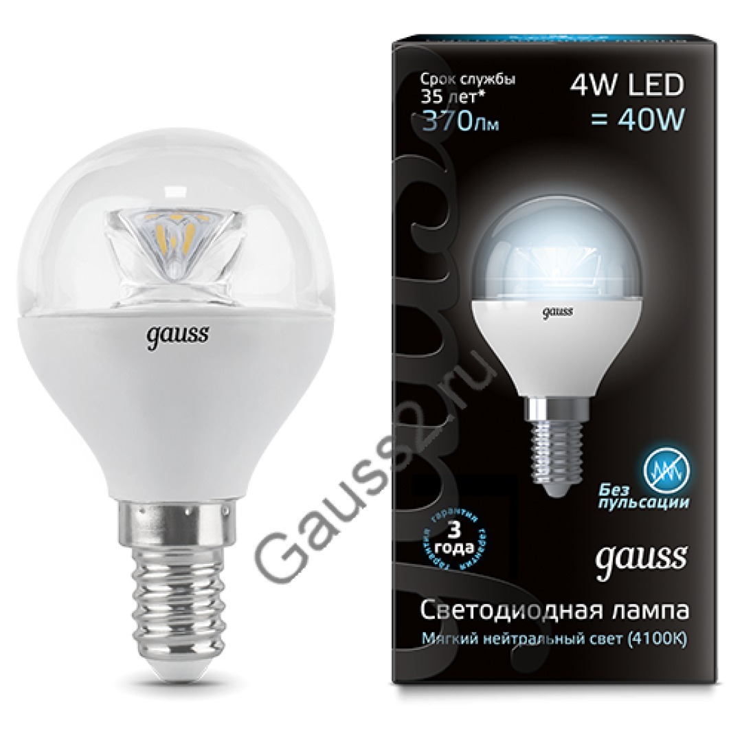 Лампа Gauss LED Globe Crystal Clear E14 4W 4100K 1/10/50