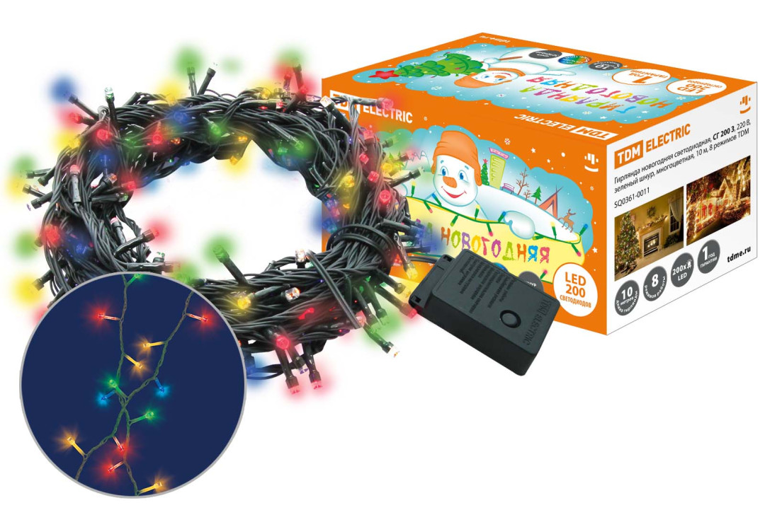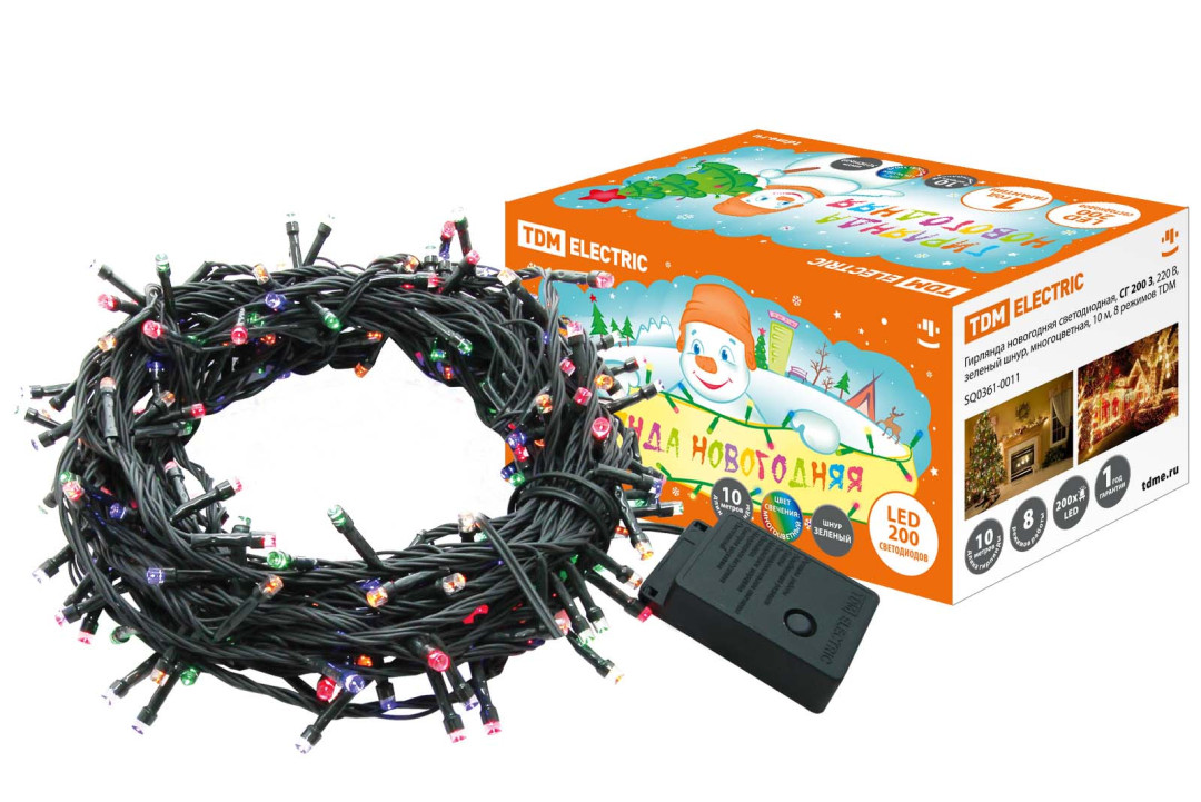 Гирлянда новогодняя светодиодная, СГ 200 З, 220 В, зеленый шнур, многоцветная, 10 м, 8 режимов TDM