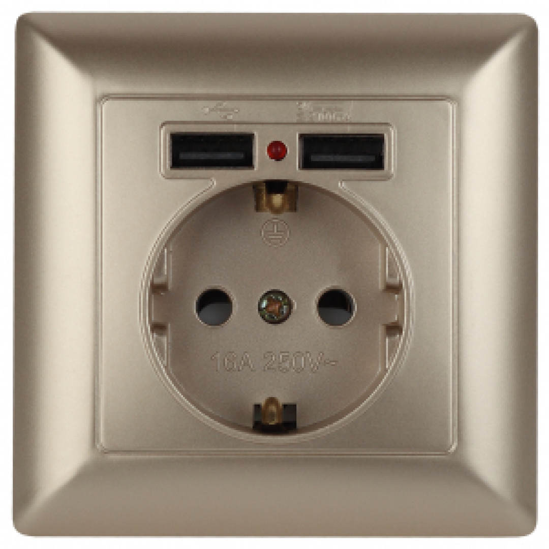 4-410-04 Intro Розетка P+E Schuko со шторками, 16А-250В + 2хUSB, СУ, Solo, шампань