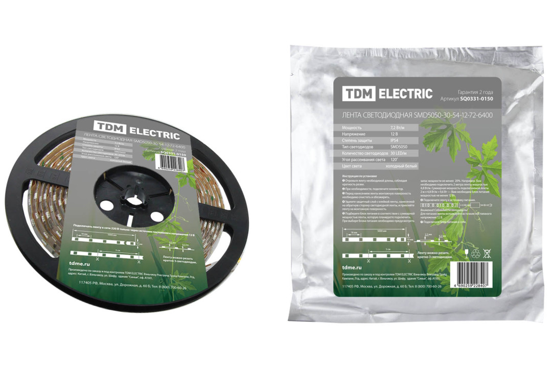 Лента светодиодная SMD5050-30-54-12-72-6400 30LED/м, IP54, 12В, 7.2Вт, 6400К, (У) TDM