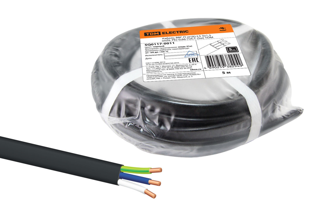 Кабель ВВГ-П нг(А)-LS 3х1,5 ок(N, PE)-0,66 ГОСТ (5м) TDM