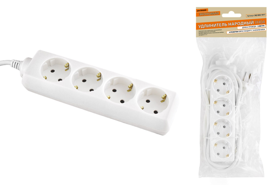 Удлинитель народный УН04 4 гнезда, 3метра, с/з, ПВС 3х0,75мм2 10А/250В