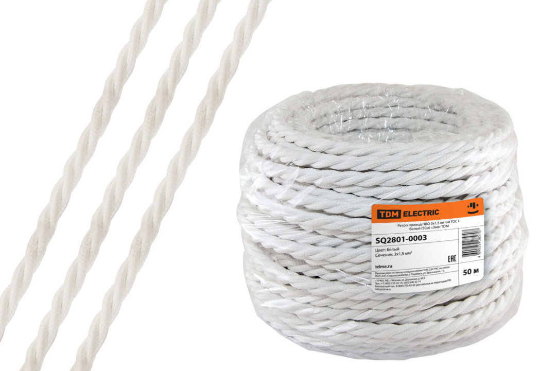 Ретро провод ПВО 3х1,5 витой ГОСТ белый (50м) "Эко" TDM