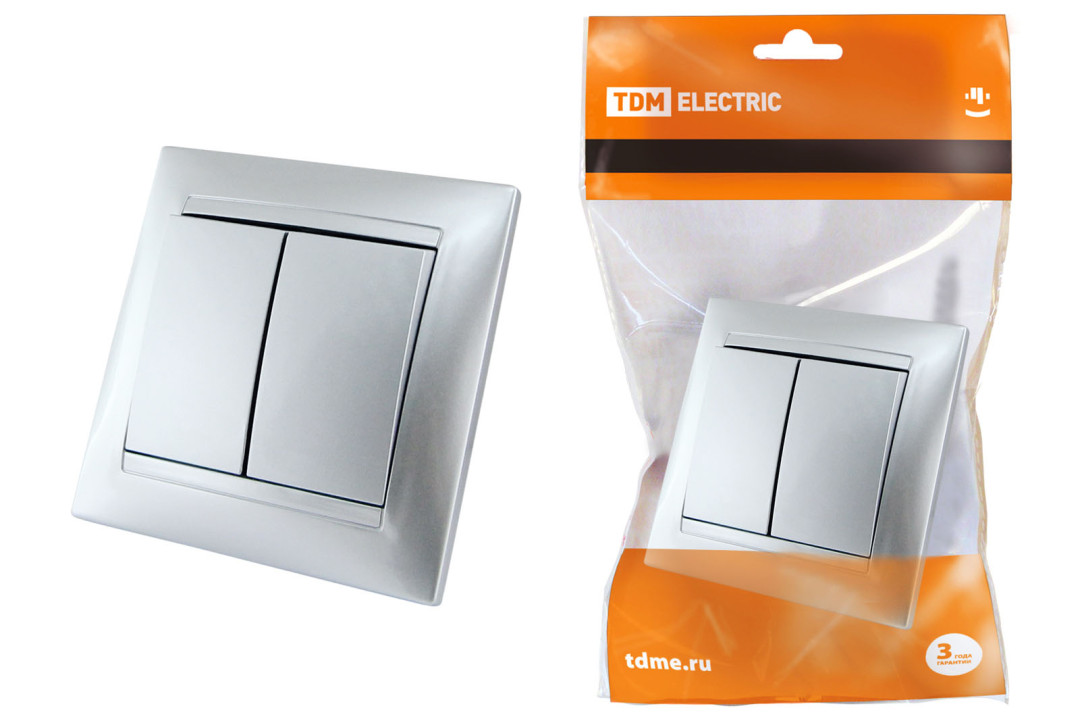 Выключатель 2-х кл. 10А серебр. металлик "Лама" TDM